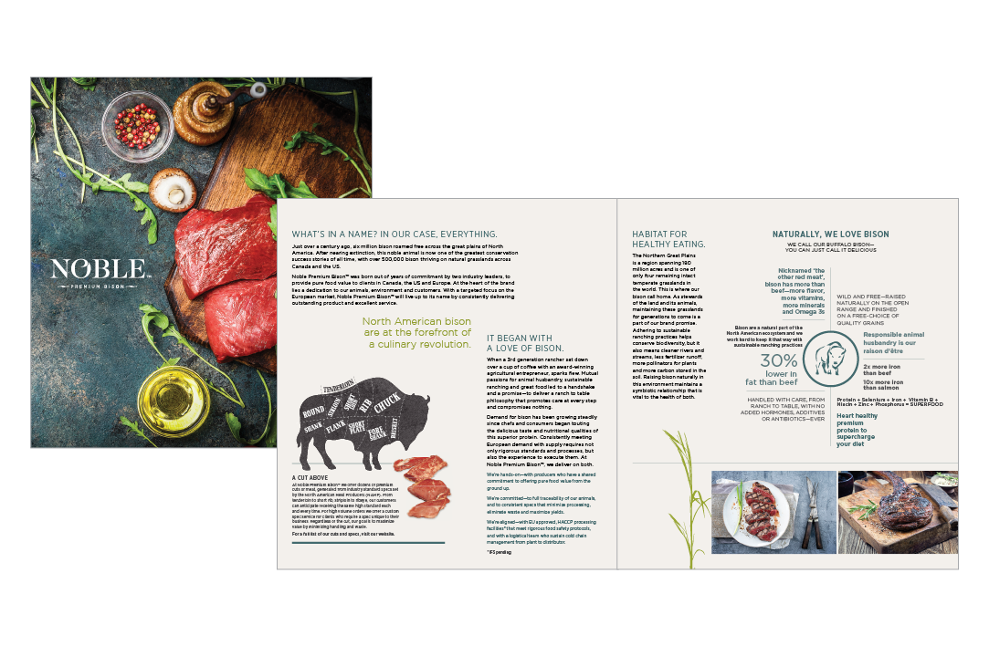 Marketing brochure, retail packaging and advertising for Noble Premium Bison – an Alberta producer with products available in grocery stores across Canada.